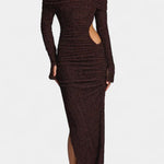 - Design og konturer: Strategiske snit fremhæver konturerne med diskret, sofistikeret elegance og passer til mange begivenheder. Rynket detalje og høj slids tilføjer struktur, bevægelse og en subtil, sensuel flair.