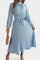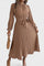 - Silhuet og detaljer: Den høje krave og den løftede talje kombineres med draperet taljebælte for en diskret, moderne grafik og komfort.