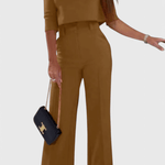 - Silhuet og pasform: 3/4-ærmet top og vide bukser skaber en ren, klassisk silhuet og fri bevægelse.