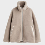 Den bløde teddy-fleece omslutter kroppen og giver en eksklusiv fornemmelse på kølige dage, mens den halvlange silhuet og den stående krave udstråler moderne raffinement.
