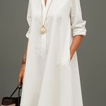 Clara | Tidløs Midi-kjole er designet til den moderne kvinde, der værdsætter tidløs enkelhed og håndværk i diskret luksus. Den rene silhuet og det skarpe krave giver en sofistikeret varme, mens den let faldende A-line og midikjolelængden skaber en balanceret bevægelse mellem struktur og lethed. Vævet i en premium bomuldsblanding, der ånder og føles eksklusiv mod huden, kombinerer Clara funktionalitet med æstetik gennem sidelommer og diskret knaplukning. Begrænset produktion giver Clara en tydelig samlerappel og en tidløs værdi, som kan overleve sæsoner. Den gennemførte konstruktion lover lang levetid og alsidighed for hverdagsbrug og særlige lejligheder, og gør den ideel til styling med sandaler, sneakers eller støvler.