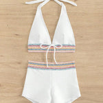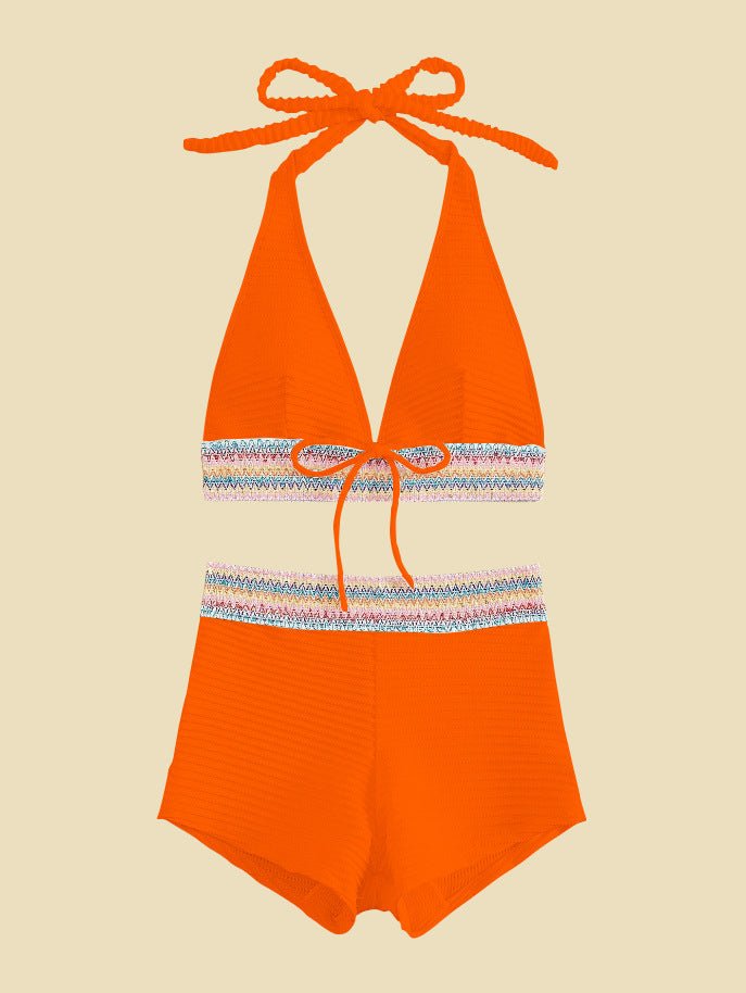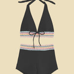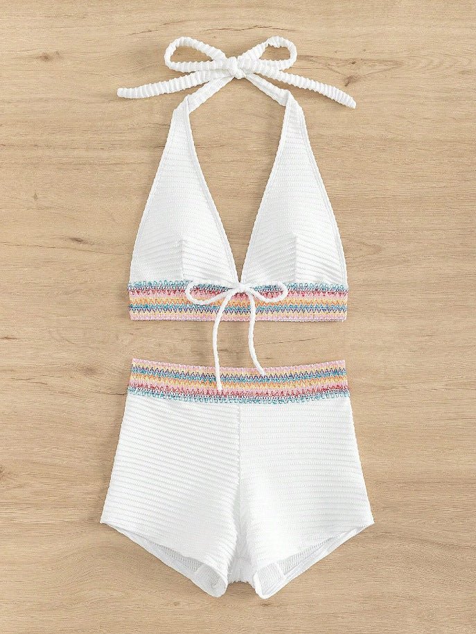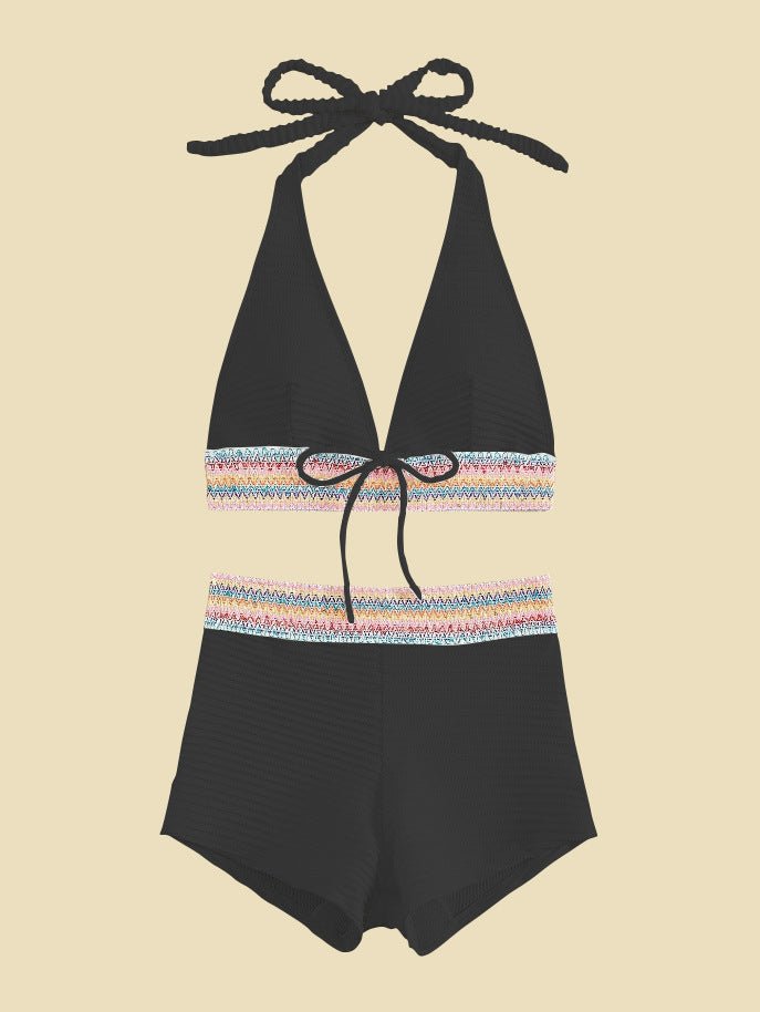 De fine kontrastdetaljer ved linningen giver bikinien et stilfuldt, sommerligt touch og gør den til et elegant blikfang på stranden eller ved poolen.
