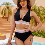 Kontrastfarver og den dybe V-udskæring skaber et moderne look, der gør dig til et blikfang på stranden.